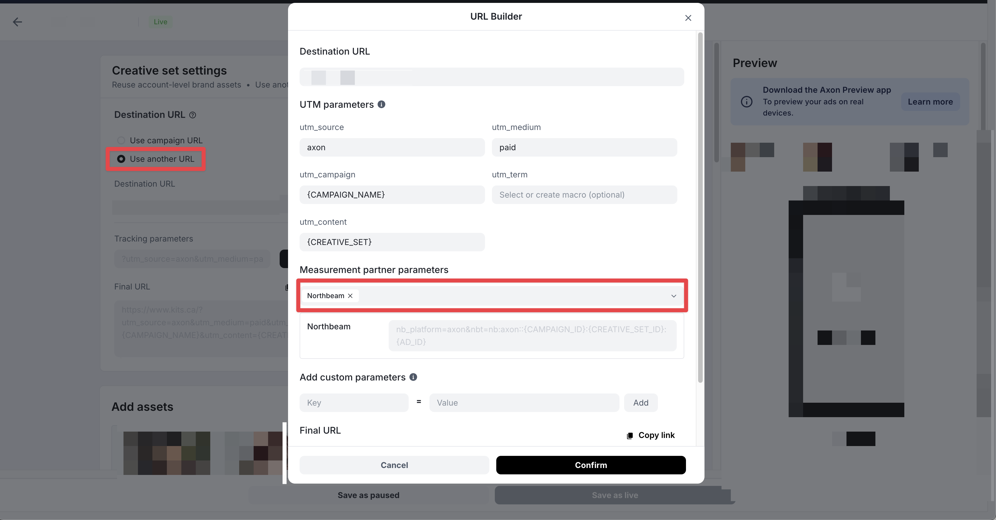 - Ensure Northbeam UTM parameters have been added to your creatives — including any creatives using "Use another URL", which require UTMs to be set at the creative level separately.