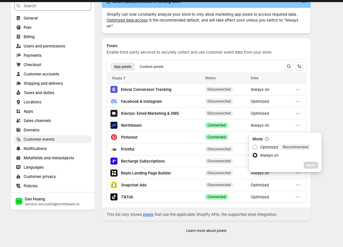 - For the Northbeam pixel, click the pixel's current data access setting in the Data column.